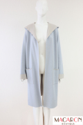 淡いライトブルーとライトグレーのバイカラー、フード付きのウールニットコートです。2019年商品