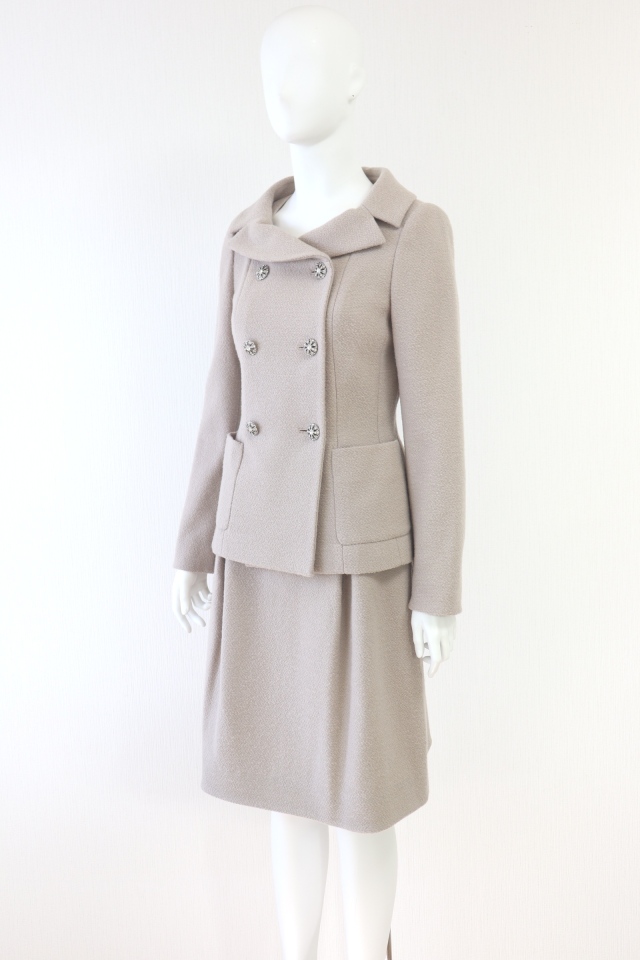 暖かみのあるウールブレンド素材、ジュエルのように輝く大きめボタンや襟の開き具合が素敵なジャケットとスカートのセットアップスーツです。2020年商品 |
