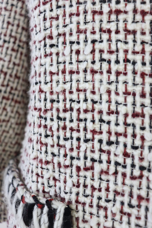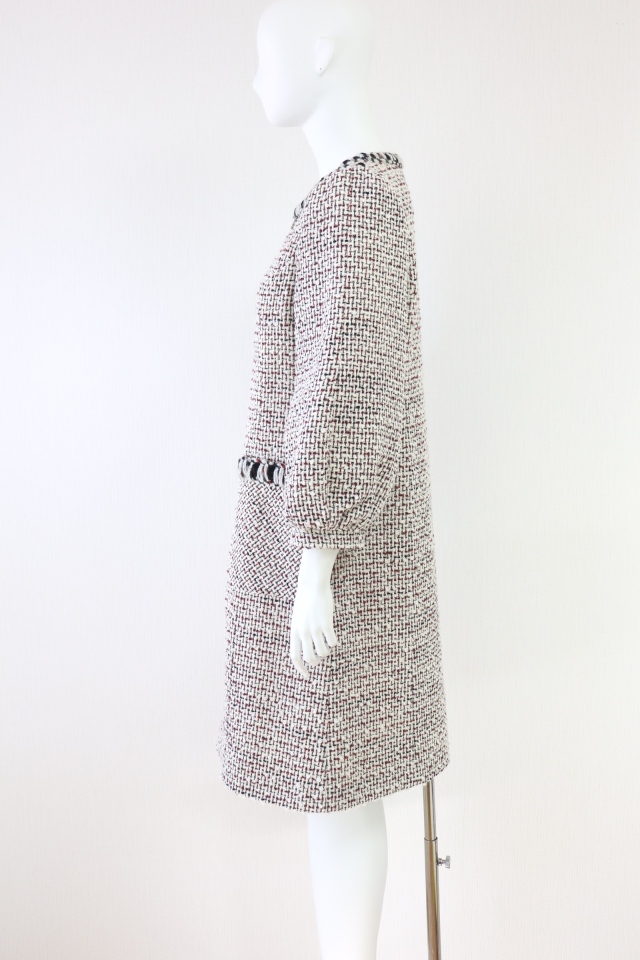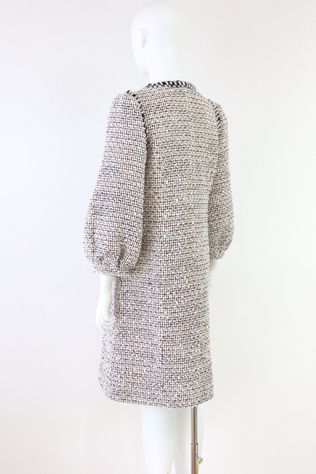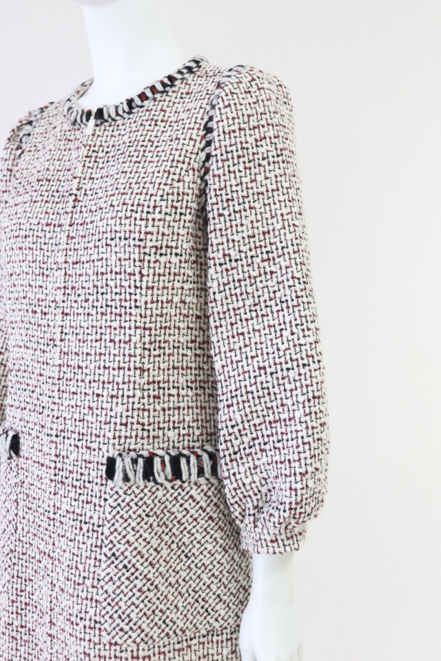 飾りブレードを施したホワイト×レッド×ブラックの糸を織り込んだツイードワンピースです。フロントジップアップ仕様。2022年商品 |