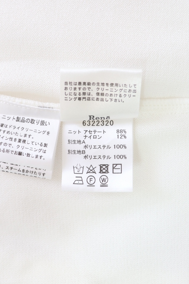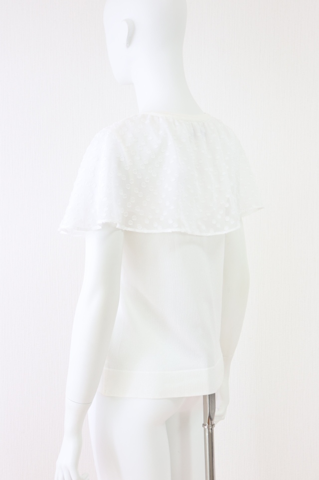 | コメント | アセテートナイロンのニット生地に透け感のあるシフォンケープカラーを重ねたトップスです。2023年商品、ホームクリーニング可能 |