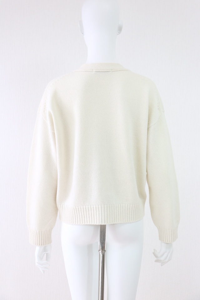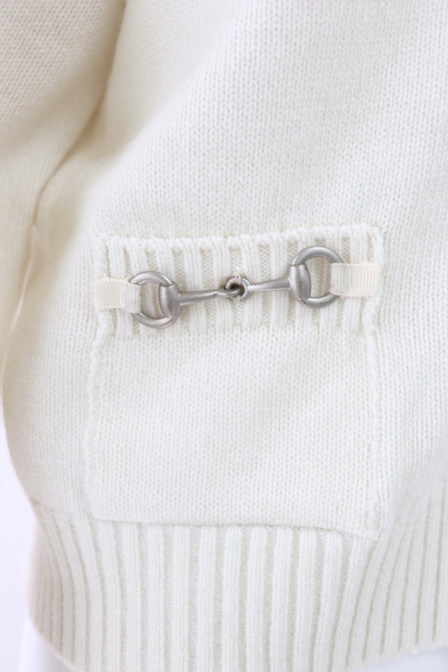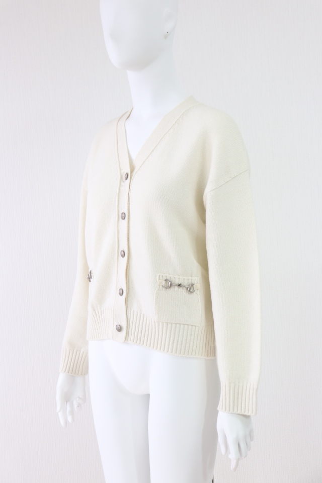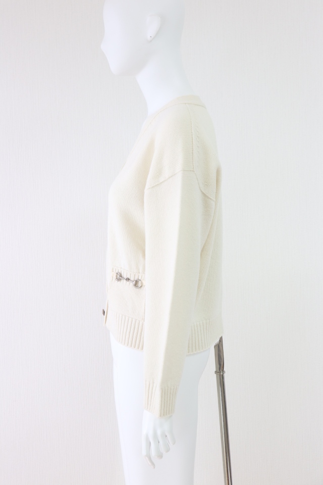 ポケットのホースビットがアクセント、ゆったり着られるドロップショルダーのウールカーディガンです。2023年商品 |